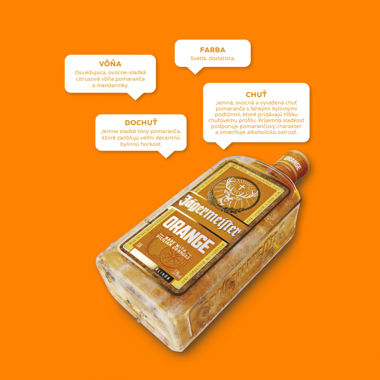 Jägermeister ORANGE je úplne iný Jägermeister, než ten, ktorý poznáš! Uvedený bol exkluzívne pre Českú a Slovenskú republiku. Jeho zásadnou ingredienciou sú vyzreté BIO pomaranče, ktoré získavame od certifikovaných dodávateľov na Sicílii. A práve vďaka nim má svoju jemnú, ovocnú a vyváženú chuť. A samozrejme si ho najviac vychutnáš ľadovo namrazený!